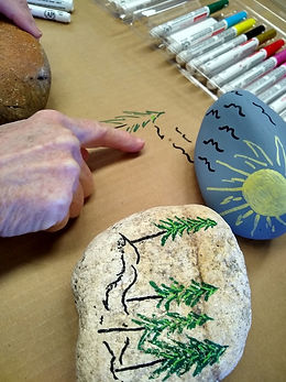 Climate River is a group project in Warner Springs CA. It is an art installation that encourages conversation as well as art making. Over the span of a few months we met and painted rocks. All of our individual paintings are now coming together to form one visual concept of a river. The age range was 6-60. Some ideas flow together, some form eddies. Viewers are free to move the stones. We encourage more to be added. Every opinion is welcome.